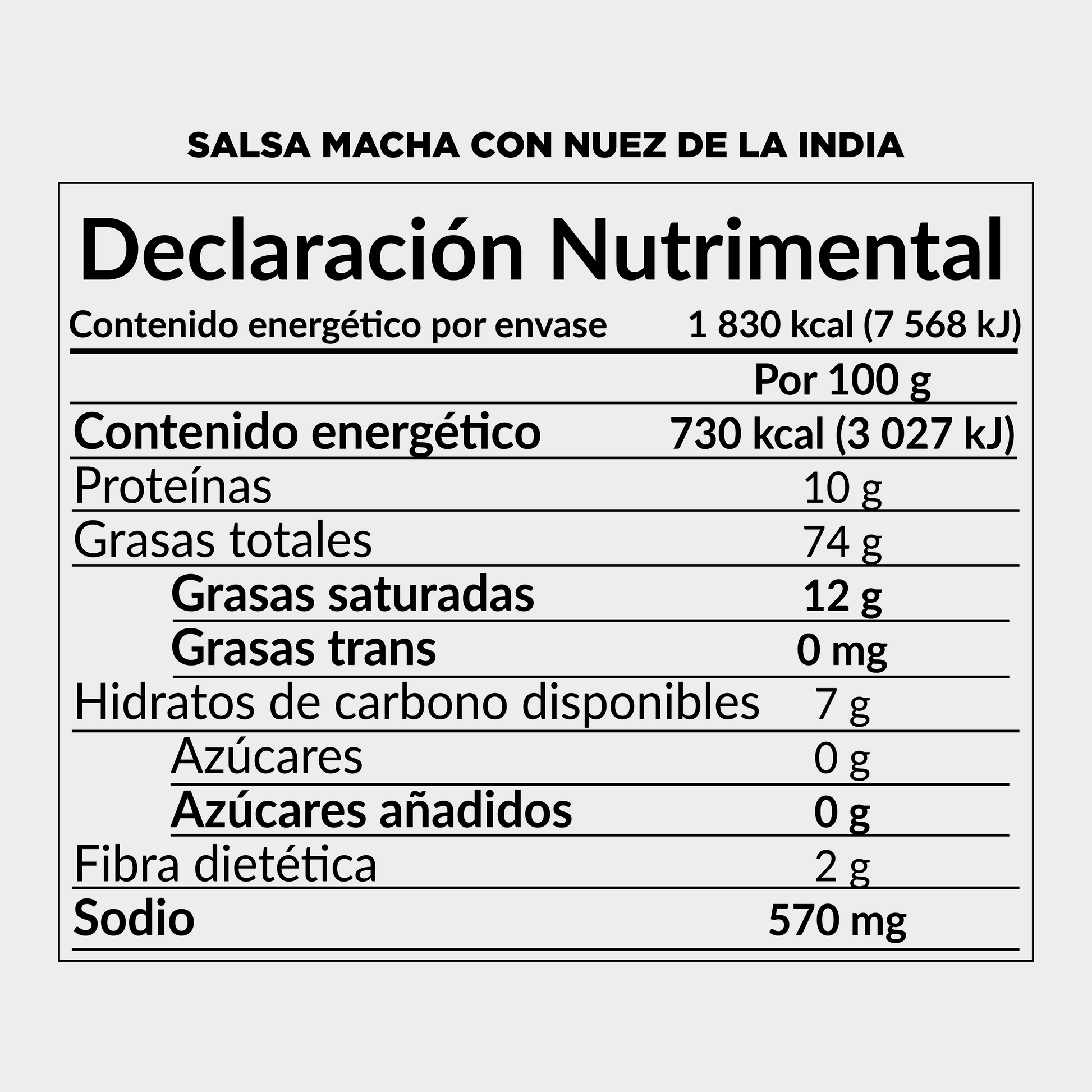 Aceite de Soya, chile de habanero 40%, cacahuate 4%, sal yodada, pepita de calabaza, ajo.